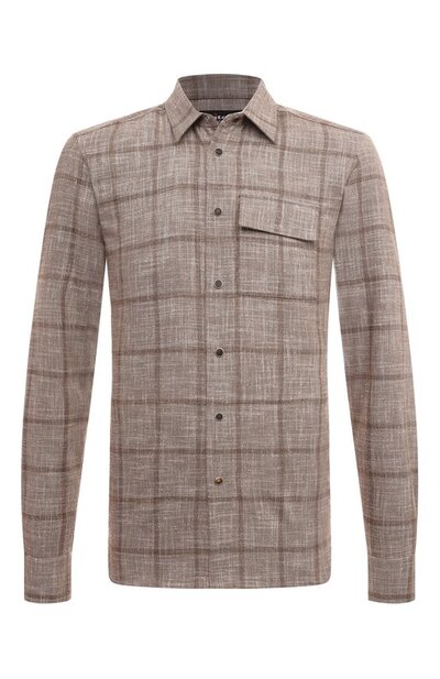 Бежевая клетчатая рубашка с воротником кент и крупным накладным карманом, закрывающимся клапаном, органично дополнит неформальный образ с брюками, курткой и кедами. Модель сшили из приятной на ощупь полушерстяной ткани, в которую добавили дышащий хлопок и прочный шелк, предупреждающий пилингование. Переплетение разных по толщине нитей придало изделию характерную фактуру и меланжевый эффект.