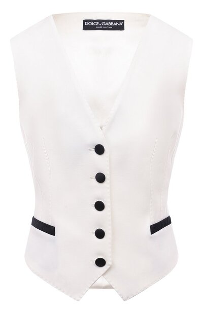 Создавая приталенный жилет, Доменико Дольче и Стефано Габбана сыграли на контрасте фактур и оттенков. Белую модель дополнили черными пуговицами и кантом на прорезных карманах. Матовой передней стороне из тонкой нежной шерсти противопоставили глянцевый блеск шелкового атласа сзади.