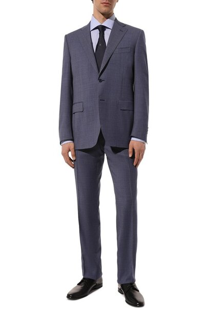 Синий костюм с прошитыми вручную стежками пунто по краям деталей органично будет смотреться в офисе или на театральной премьере. Пиджак с четкой линией плеч и прямоугольными лацканами выполнили из тонкой шерсти, поддерживающей оптимальный микроклимат. Из такого же немнущегося материала в микроклетку создали прямые брюки со стрелками.