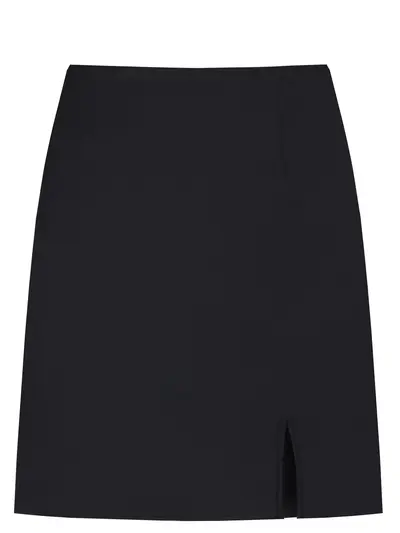 -Черное мини-платье из тонкой шерсти от JULI TOO. -Модель с кроем по фигуре, высокой посадкой, разрезом на бедре и застежкой на потайную молнию. -Юбка дополнит как повседневные, так и коктейльные образы с изящной обувью на высоких каблуках.