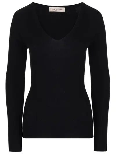 -Черный пуловер из рельефного трикотажа купажированного состава от GENTRYPORTOFINO. -Модель облегающего силуэта с длинными рукавами и мягким V-образным вырезом на груди станет как базой под пиджак, так и самостоятельной вещью в образе.