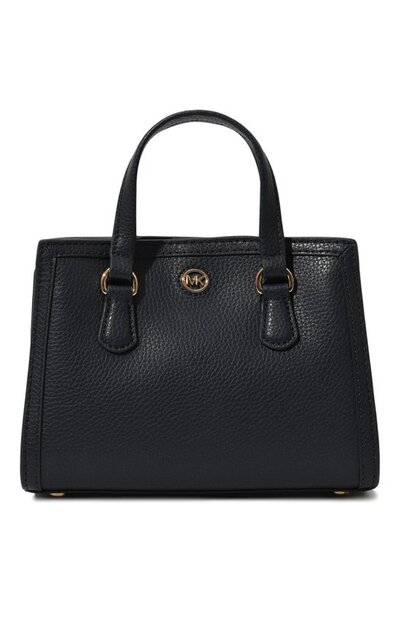 Небольшую темно-синюю сумку Chantal можно носить не только в руке, но и на плече или как кросс-боди благодаря съемному ремню с вставками-цепочками. Для создания аксессуара, украшенного золотистой монограммой MK, использовали пластичную крупнозернистую кожу с деликатным блеском. Внутрь поместятся телефон, кошелек и ключи.