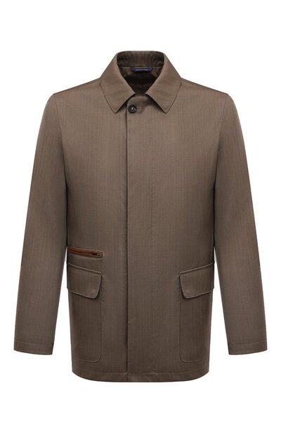 Лаконичный крой и светло-коричневый цвет адаптируют эту куртку для образов любой степени сложности. Для пошива модели с отложным воротником и супатной застежкой использовали мягкую тонкую шерсть с шевронным микроузором. В состав ткани добавили гладкий шелк, придающий изделию с тремя карманами прочность, элегантный блеск и игру полутонов.