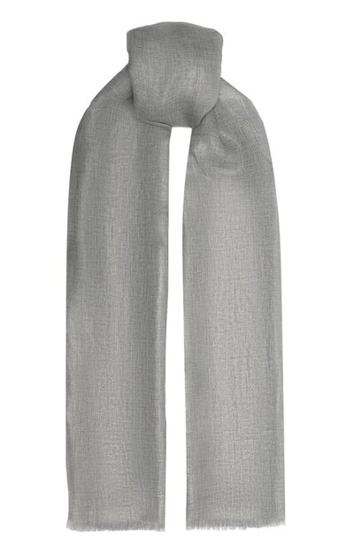 Для изготовления серого палантина использовали легкое ламе с блеском. Материал, сотканный из тонкого льна, волокна которого неравномерно впитали краситель, сформировав меланжевый эффект, почти ничего не весит и поддерживает оптимальный микроклимат. Края изделия декорировали короткой бахромой.