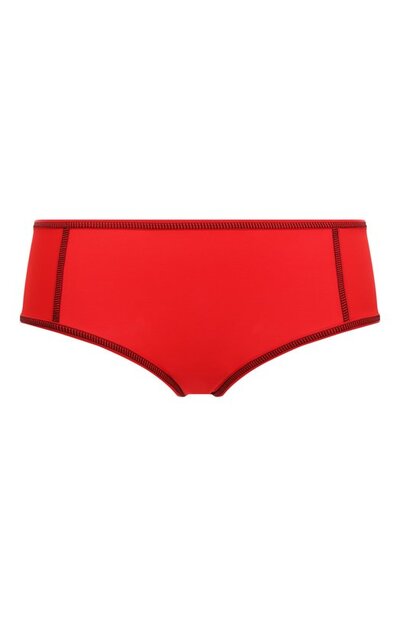 Красные плавки-бикини сшили из мягкой шелковистой микрофибры, которая быстро сохнет и легко тянется, плотно облегая бедра, но не теряя форму в воде. Модели придали спортивное звучание плоскими выведенными наружу швами, выполненным черной нитью. Такого же цвета — логотип марки в готическом стиле сзади.
