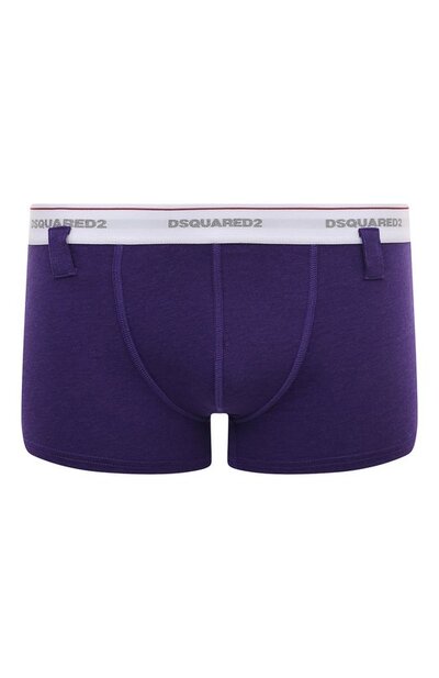 Фиолетовые боксеры сшили из тонкого хлопкового джерси, поддерживающего оптимальный микроклимат. Модель приятно ощущается на коже, хорошо тянется и обеспечивает циркуляцию воздуха. Контрастный широкий пояс изделия со шлевками украсили узкой полосой и паттерном в виде логотипа.