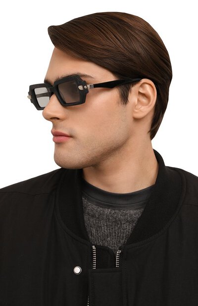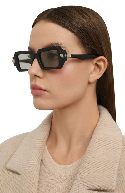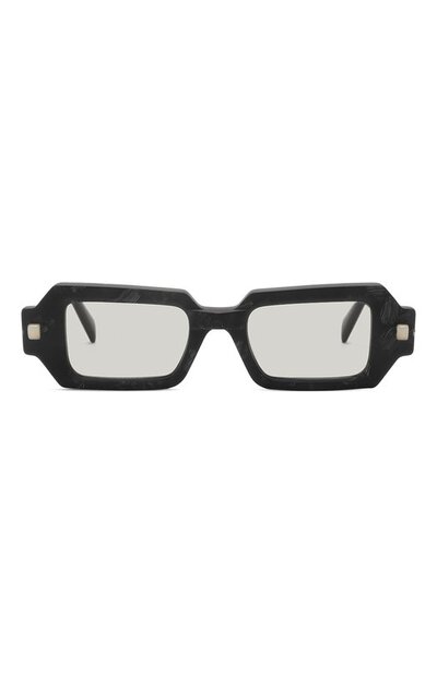 Визуально массивную оправу архитектурного силуэта итальянские мастера выполнили вручную из ацетата Mazzucchelli, поэтому модель получилась легкой и прочной. Выразительнее ее делает необычное крепление дужек, которые будто пронзают широкие ободы. Светло-серые линзы обеспечивают надежную защиту от ультрафиолета.