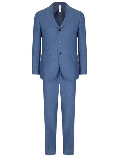 -Синий костюм из меланжевого льна от 120% LINO. -Однобортный пиджак приталенного кроя с длинными рукавами, листочкой, прорезными карманами с клапанами, лацканами и отложным воротником, застежкой на пуговицы, шлицами сзади. -Брюки классического кроя и посадки с поясом со шлевками, прорезными карманами, застежкой на молнию и пуговицу.
