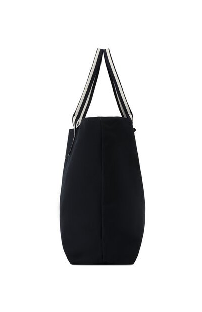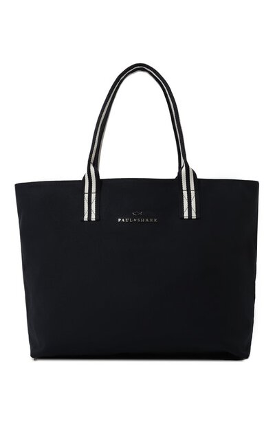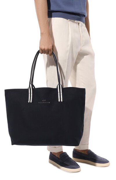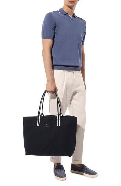 В коллекцию Riviera, вдохновленную атмосферой итальянских пляжей, вошла темно-синяя сумка из плотной хлопковой ткани. Две ручки средней длины выполнили из полосатой ленты грогрен, а переднюю панель украсили логотипом, который сочетали с фирменным силуэтом акулы. В аксессуар с внутренним карманом на молнии поместятся купальные принадлежности, полотенце, бутылка воды и футляр с солнцезащитными очками.