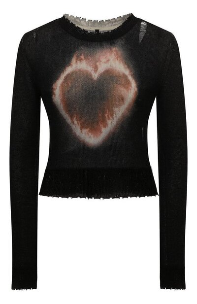 Укороченный черный пуловер выглядит как винтажная вещь. Иллюзию создают неровные края с выступившими нитями и вязаный узор, имитирующий разрывы со спущенными петлями. Ярче модель делает крупный принт в виде пылающего сердца спереди. Изделие связали из тонкой кашемировой пряжи, поэтому оно приятно ощущается на теле и отлично сохраняет тепло.