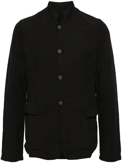 black linen/flax stand-up collar chest welt pocket long sleeves buttoned cuffs two side flap pockets curved hem unlined front button fastening