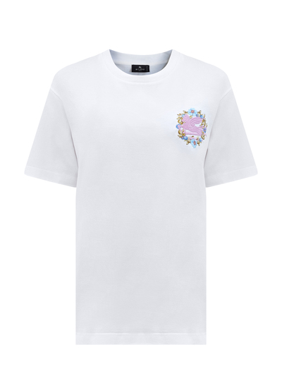 Футболка свободного кроя от Etro выполнена из гладкого хлопкового джерси базового белого цвета — дышащий материал с полностью натуральным составом идеально подходит для летнего сезона. Лаконичное исполнение оттеняет вышитый вручную логотип Pegaso на передней планке. Сделано в Италии.