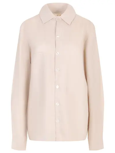 -Бежевая рубашка из легкого дышащего льна от LÉAH. -Модель свободного кроя со спущенной линией плеча, короткими рукавами, отложным воротником, нагрудным накладным карманом, застежкой на пуговицы. -Благодаря отличным свойствам терморегуляции льна рубашка подойдет для летнего зноя и дополнит образы с легкими брюками или шортами.