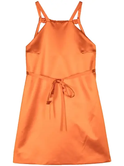 pumpkin orange satin finish halterneck sleeveless belted waist elasticated band bow detailing open back straight hem full lining concealed rear zip fastening