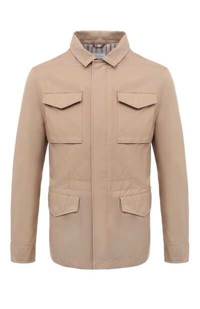Куртку с регулируемыми манжетами и двумя шлицами сшили из усиленной полиэстером хлопковой ткани с водоотталкивающим покрытием. Модель с потайным поясом-кулиской и четырьмя накладными карманами с клапанами застегивается молнией, скрытой под штормовой планкой.