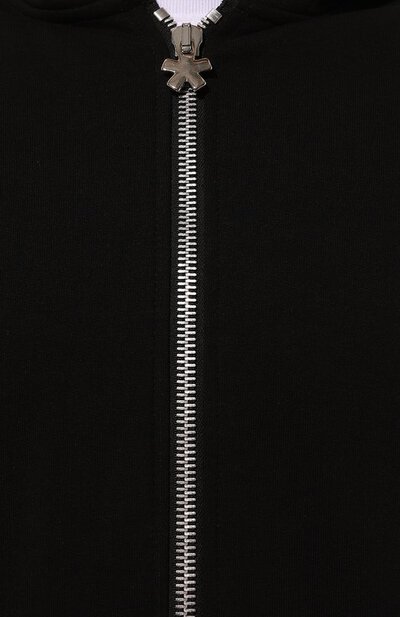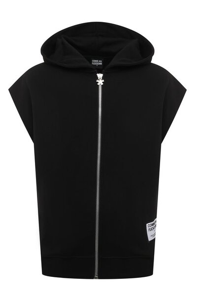 Для пошива черного жилета с объемным капюшоном и спущенной линией плеч использовали мягкий хлопковый трикотаж, который отлично пропускает воздух и хорошо сохраняет тепло. Изделие, застегивающееся широкой молнией с фигурным пуллером-эмблемой, дополнили крупным фирменным патчем спереди.