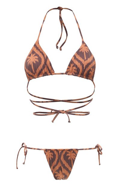Коричневое треугольное бра с мягкими чашечками сшили из нежной эластичной микрофибры с паттерном в виде символичных пальм. Из такого же быстро сохнущего материала выполнили плавки. Посадку раздельного купальника удобно регулировать с помощью узких завязывающихся бретелей и поясов.