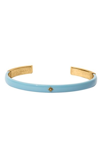 Узкий лаконичный браслет станет деликатным акцентом в образе. Незамкнутую модель, которую можно носить и на обнаженном запястье, и поверх рукава, выполнили из позолоченного ювелирного сплава, покрытого пастельно-голубой глянцевой эмалью. Концы аксессуара украсили волнистым выгравированным узором, центр — миниатюрной звездой со сверкающим прозрачным кристаллом.