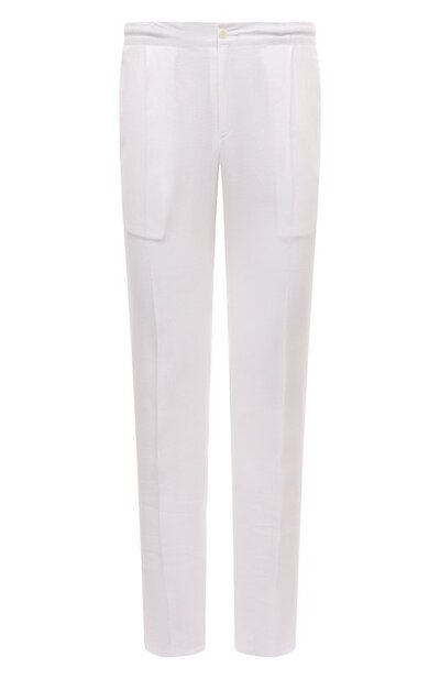 Для пошива белоснежных брюк мастера неаполитанской марки использовали мягкий тонкий лен, волокна которого обладают терморегулирующими свойствами. Модель с прорезными карманами и эластичной вставкой на поясе сзади хорошо пропускает воздух и приятно ощущается на коже. Наши стилисты предлагают создать непринужденный образ с поло, завершив его лоферами.