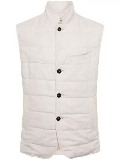 light beige/black cotton-linen blend quilted stand-up collar front button fastening sleeveless chest welt pocket two side welt pockets curved hem