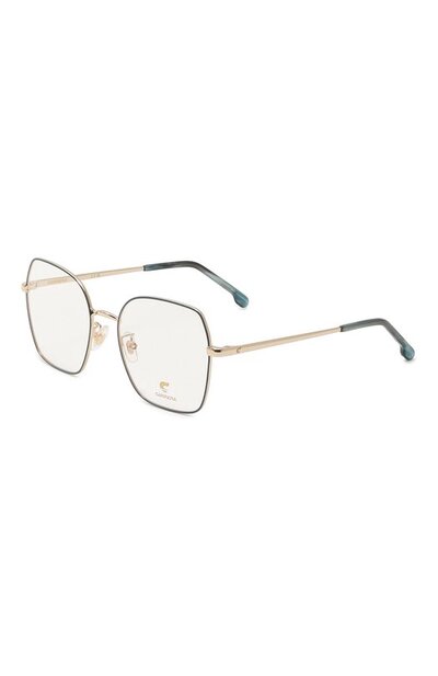 Крупные ободы этой оправы сделали ультратонкими, поэтому она выглядит легко и не утяжеляет образ. Для изготовления аксессуара использовали прочную нержавеющую сталь с золотистым гальваническим покрытием. Узкие дужки с выгравированным логотипом на внутренней стороне дополнили зелеными ацетатными заушниками.