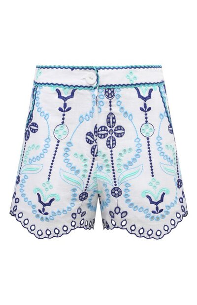 Белые шорты с широким поясом и двумя врезными карманами выполнены из тонкой дышащей ткани на основе хлопка и льна. Легкая модель с фестончатыми краями украшена голубыми вышитыми узорами с ажурным цветочным мотивом. Наши стилисты предлагают создать образ с парной рубашкой и бежевыми сандалиями и сумкой.