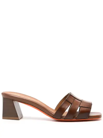 chocolate brown calf leather faded effect interwoven strap detailing slip-on style square open toe branded footbed low block heel