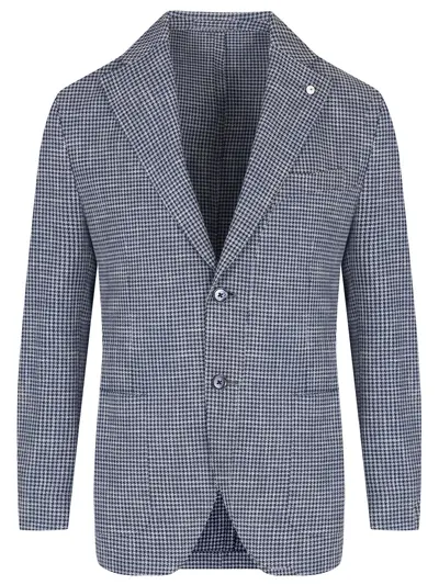 -Синий пиджак из смесовой шерсти с узором пье-де-пуль от L.B.M.1911. -Однобортная модель с кроем по фигуре, длинными рукавами, листочкой, крупными накладными карманами, лацканами и отложным воротником, застежкой на пуговицы, шлицами сзади.
