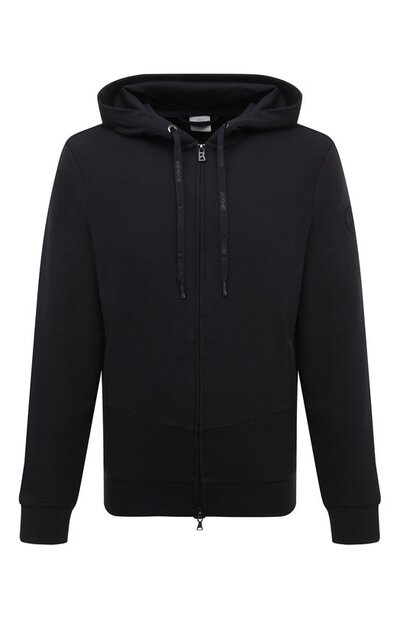 Темно-синее худи из микса хлопка и полиэстера только кажется предельно лаконичным. Вблизи на плотном материале становится заметной рельефная диагональная полоска. Мелкой фактуре противопоставлены эластичные гладкие вставки на спинке и на рукавах, один из которых украшен вышитой литерой B. Врезные боковые карманы застегиваются молнией, как и сама модель прямого кроя.