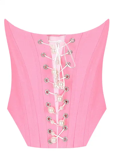 -Розовый корсет из дышащего льна от ALINE. -Модель облегающего кроя с плотной основой, которая моделирует фигуру и хорошо поддерживает грудь. -Спереди корсет дополнен шнуровкой и жемчужными бусинами, сзади - застежка на молнию.