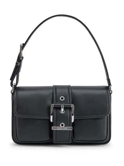 black leather adjustable shoulder strap front buckle fastening main compartment internal slip pocket silver-tone hardware