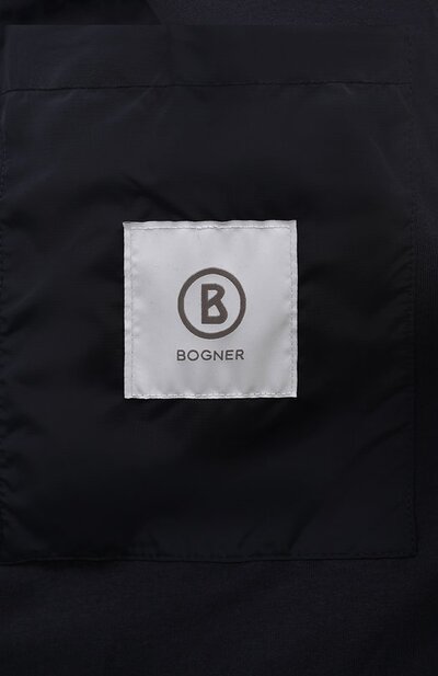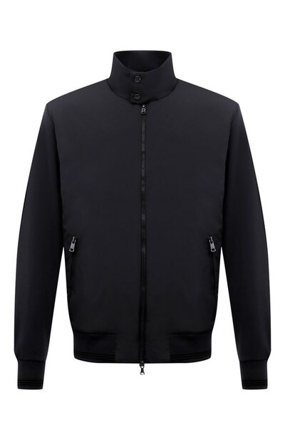 При создании синего бомбера с эластичными поясом и манжетами использовали разные по фактуре материалы. Основу модели сшили из плотного хлопкового трикотажа, усиленного полиэстером, а полочки — из непромокаемого рипстопа. Куртка, как и боковые карманы, застегивается молнией, высокий воротник-стойка — двумя кнопками.