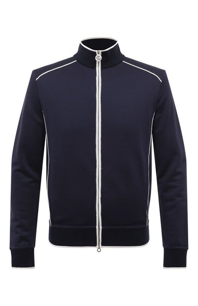 Эта темно-синяя толстовка идеально дополнит образ для прохладных дней. Модель из мягкого хлопкового трикотажа с добавлением прочного шелка дополнили крупной вышивкой сзади и белым узким кантом, очерчивающим детали кроя. Изделие с высоким воротом и боковыми карманами застегивается на молнию.
