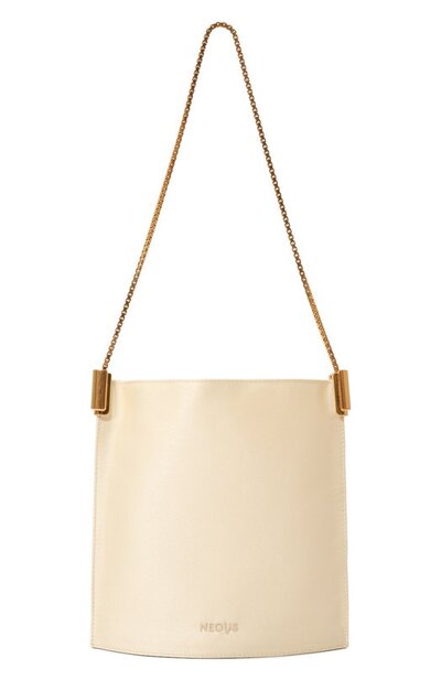 Кремовую сумку Dorado прямоугольной формы вручную выполнили из плотного атласа. Спереди изделие украсили небольшим логотипом бренда, вышитым шелковистыми нитями в тон. Роль акцента отдали золотистому плечевому ремне-цепочке с крупными креплениями. В аксессуар поместятся смартфон, картхолдер и ключи.