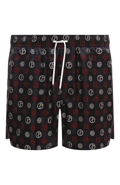 Темно-синие плавки-шорты с жаккардовым красно-серым паттерном в виде эмблемы сшили из прочного блестящего материала, который быстро сохнет и не вытягивается в воде. За удобную посадку на талии отвечает широкий пояс с регулируемой кулиской. Модель дополнили тремя карманами: боковыми и прорезным задним с пуговицей.
