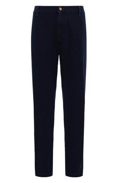 Для пошива темно-синих брюк использовали мягкий гладкий материал на основе длинноволокнистого хлопка, который не препятствует циркуляции воздуха. Благодаря полиэстеру в составе изделие не теряет форму со временем. Для более комфортной посадки модель дополнили эластичным поясом. Сзади разместили небольшую эмблему марки.
