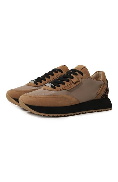 Кроссовки сшили из разных по фактуре материалов: шелковистого текстиля, бархатистого прочного нубука и ворсистой кожи пони с леопардовым принтом. За комфорт при ходьбе отвечает легкая широкая подошва с зубчатым протектором.