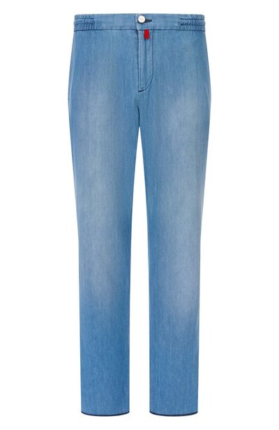 Голубые джинсы с меланжевым эффектом станут удачным пополнением гардероба и органично дополнят образ с футболкой и рубашкой. Брюкам из мягкого приятного на ощупь денима придали сходство с чиносами с помощью широкого эластичного пояса и четырех прорезных карманов. Принадлежность марке подчеркнули патчем с логотипом на поясе, зарифмованным с брендированной фурнитурой.