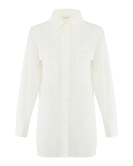 Блуза P.A.R.O.S.H. изтонкого полупрозрачного материала с кружевными вставками. Прямой силуэт дополнен застежкой на пуговицы и отложным воротником.