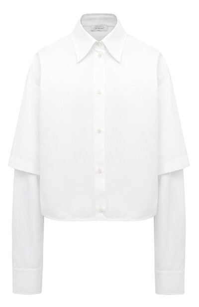 При пошиве белой однотонной рубашки из линии Bookish длинные рукава продублировали короткими накладками, создав эффект многослойности. Спереди приятную на ощупь модель со спущенной линией плеч украсили вышитой монограммой OW. Изделие выполнили из тонкой хлопковой ткани, обеспечивающей комфортный микроклимат.
