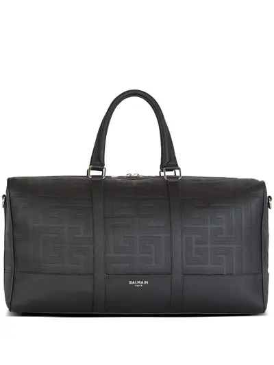black calf leather grained texture embossed monogram pattern logo stamp to the front two rolled top handles adjustable detachable shoulder strap two-way zip fastening main compartment internal zip-fastening pocket internal card slot silver-tone hardware