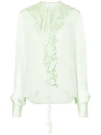 light green crepe de chine semi-sheer construction round neck with tie-fastening straps ruffled detailing to the front long puff sleeves with buttoned cuffs side slits high-low hem unlined front button fastening