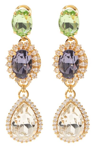 Серьги от Антона Хейниса сделают даже повседневный образ более нарядным. Аксессуар с итальянской застежкой дополнили двухъярусной подвеской, которую, как и само основание, инкрустировали сверкающими кристаллами разных цветов, размеров и форм.