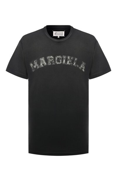 Нарочито состаренная темно-серая футболка прямого кроя сшита из мягкого хлопкового джерси. Легкая модель с круглым вырезом и короткими рукавами украшена спереди крупной надписью с названием бренда, основанным Мартином Маржелой, стилизованной под символику университетов. Предлагаем создать образ с джинсами в тон, черным бомбером и белыми кедами.