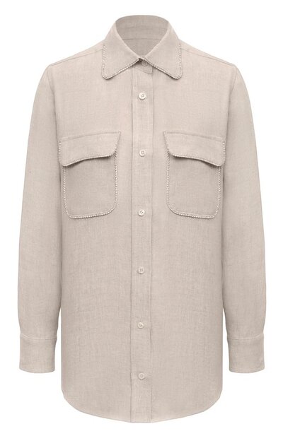 Прямую рубашку сделали женственнее, подчеркнув отложной воротник и нагрудные карманы с клапанами кантом из сверкающих кристаллов. Для пошива модели, представленной эксклюзивно в ЦУМе, использовали тонкий мягкий лен. Его пористые лубяные волокна обладают антибактериальными и терморегулирующими свойствами, поэтому изделие сохраняет ощущение свежести даже в сильную жару.
