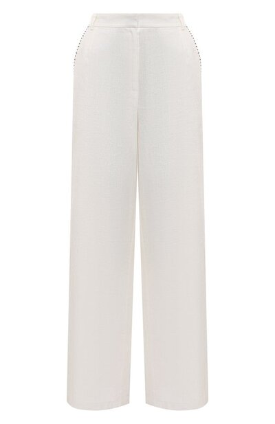 Свободные брюки из тонкого белого льна помогут создать идеальный летний образ. Дышащая ткань с неровной фактурой создает ощущение прохлады, быстро впитывая и испаряя влагу, а за комфортную посадку по фигуре отвечает эластичная вставка на поясе. Боковые карманы подчеркнуты черной вышивкой, а задние остались без декора.