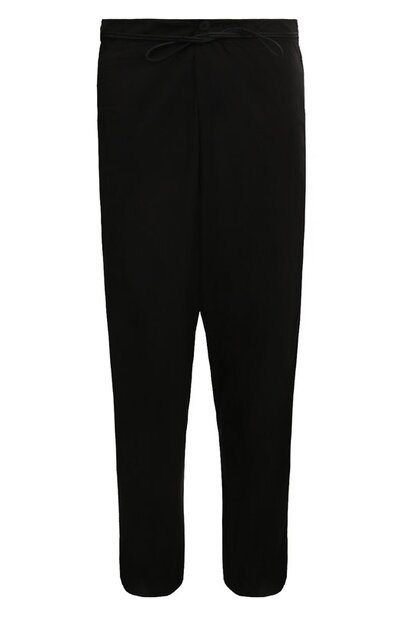 Черные брюки с асимметричной застежкой и заниженной линией шага сшиты из прочного дышащего хлопка. Модель с четырьмя врезными карманами дополнена поясом с встроенным вощеным шнуром, регулирующим посадку. Предлагаем создать монохромный образ с рубашкой, блейзером и кедами в тон.