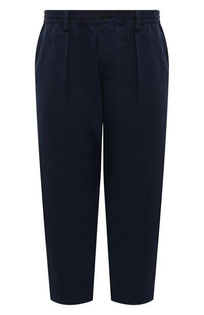 Темно-синие брюки с немного заниженной шаговой линией станут комфортной основой нестрогого образа. Лаконичный дизайн помогает модели подружиться с вещами разной гаммы. Для пошива изделия с двумя парами карманов и широким эластичным поясом использовали плотную хлопковую саржу.