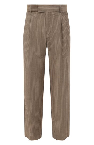 Для пошива коричневых брюк в узкую вертикальную полоску использовали тонкую ткань на основе прочного полиэстера и мягкой шерсти. Шелковистый текстиль практически не мнется, долго сохраняя опрятный вид. Модель с тремя карманами дополнили спереди защипами, сделав брючины свободнее.