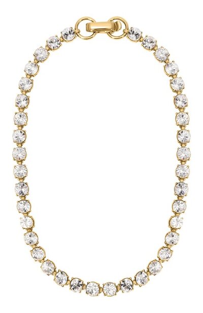 Узкий чокер добавит сияющий акцент вечернему наряду. Аксессуар выполнили в виде гибкой цепочки, каждое звено которой инкрустировали сверкающим прозрачным кристаллом драгоценной огранки. Модель из полированного сплава с блестящим золотистым покрытием застегивается небольшим карабином.